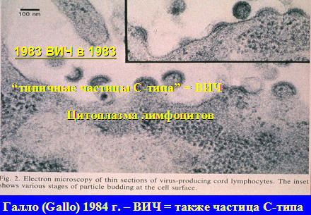 Позднее стало известно, что этот отрывок из работы Монтанье (Montagnier) написал Галло (Gallo), однако кроме того, в своих собственных работах 1984 года по выделению штамма Галло (Gallo) также отнес «новый ретровирус» к тому же роду частиц типа С.