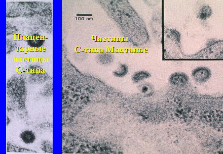 Данный снимок представляет собой изображение плацентарной частицы С-типа рядом со снимком частиц ВИЧ, обнаруженных Монтанье в 1983 году. В 1983 году о них сообщалось как о «типичных частицах С-типа».