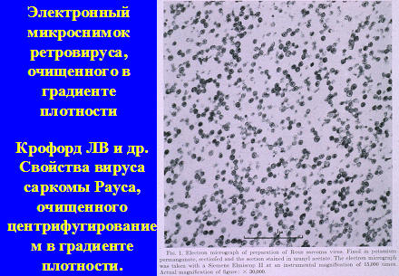 Этот слайд был опубликован в 1961 году и подтверждает, что возможно сделать электронный микроснимок в диапазоне 1,16 г/мл и показать очищенные ретровирусные частицы. Это частицы вируса саркомы Рауса, животного ретровируса, открытого Раусом в 1911 году. Заметьте, что в отличие от множества снимков ВИЧ, этот снимок имеет измерительную линейку 1000 нанометров.