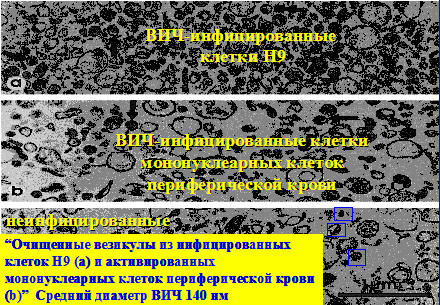Верхняя часть, обозначенная (a), представляет собой диапазон 1,16 г/мл из инфицированных клеток, то есть ВИЧ-инфицированных клеток Н9. Эта часть в середине, обозначенная (b), опять же представляет собой диапазон 1,16 г/мл, снова из инфицированных клеток, однако на этот раз клетки были получены у обычных людей.