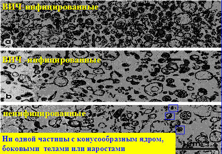 Рассматривая участки (а) и (b), сложно решить, на основании каких именно критериев авторы классифицировали частицы как ВИЧ. И какими бы ни были эти критерии, частицы не обладают всеми морфологическими характеристиками, которыми должны обладать ретровирусные частицы.