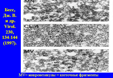 Это электронный микроснимок, опубликованный Монтанье (Montagnier). На этом слайде широкая непрерывная структура в нижней половине представляет собой часть лимфоцита пуповины. На ее поверхности имеется несколько пузырьков (почек), а рядом – несколько бесклеточных частиц. Говорилось, что эти формы являются «производящими вирус лимфоцитами пуповины, на которых выявлены различные стадии почкования частицы на поверхности клетки».
