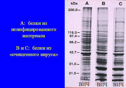 Иными словами, по нашему мнению, одинаковые белки, имеющие одинаковый молекулярный вес, присутствуют во всех образцах, подвергнутых концентрации в градиенте плотности. Инфицированные и неинфицированные. Единственное отличие между всеми этими полосами – количественное, а не качественное.